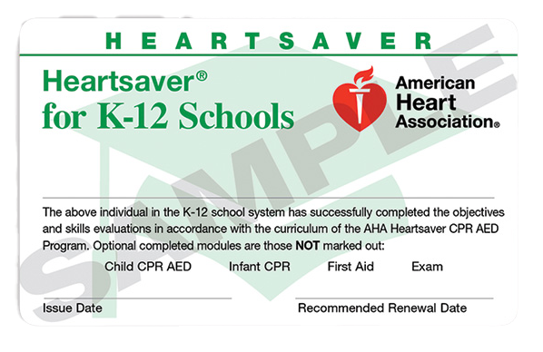 The Heartsaver for K-12 Schools eCard may be provided by AHA Training Center Coordinators to K-12 school students, faculty, and staff who successfully complete an AHA Heartsaver First Aid CPR AED, Heartsaver CPR AED, or Heartsaver First Aid Course. “Faculty” refers to teachers and coaches; “staff” refers to an employee of a K-12 school or K-12 school system.